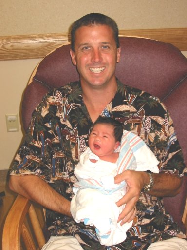 At the hospital I found Priscilla in a Triage room with Teresa at her side. The nurse double checked the cervix and found it to be about 2 centimeters dilated. Now this is about 9:40pm. Dr Donnelly is still on her way, and Priscilla is starting to scream. Not those often heard screams of "I LOVE TOM WILLIAMS" These were screams of pain. I was using my best material trying to make her laugh, and nothing. Now if I can't get you to laugh one of two things are happening. Either one I am still dressed or two you are in a lot of pain. Anyway I asked the nurse for something to help with the pain. I mean my ears and hands were killing me. Now for all of you guys out there that have not been in the delivery room. DO NOT an I mean DO NOT under no circumstance hold on to you wives hand while she is having a contraction. No matter how much she begs you--do not do it. She will snap your fingers off with out hesitation. SHE DOES NOT CARE! In her eyes THIS IS ALL YOU FAULT! Back to the action. I asked the nurse to help Priscilla with the pain. She said that Dr Donnelly will be here soon and to try the "breathing technique". That to me is a load of you know what. So now we are at about 10 pm. The nurse decides to check the cervix again. This, I am guessing, is a not so nice feeling. (Boys, I would relate this to a bowling ball being dropped three stories on to your crotch.) Anyway She checks the cervix setting Priscilla's alarm off, and walks out the door. I could here the nurses in the hall and it did not sound that good. The door swings open and the SWAT TEAM of the OB ward jumps in. The head nurse yells at Priscilla to stop screaming, and not to push. Within 30 second they change the room into a delivery room. They have a Doctor stand in for Dr Donnelly and now we have 5 woman yelling "PUSH". I guess we went from 2 centimeters to ten and fully effaced in about 5 minutes time. Now Dr Donnelly walks in to a crowd of women just in time to catch the baby. WOW what a thing to watch. We had no clue what the good Lord had in store for us that day.